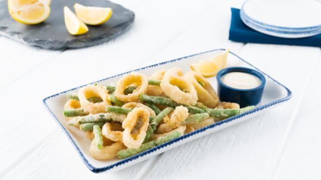 Crispy calamari and green beans served with a lemon-garlic aioli